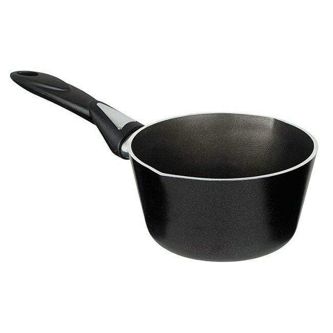 Black Diamond 16cm non stick milk pan, high quality non stick, pouring lips both sides making it ideal for both left or right handed use. Comfortable designer handle with metallic trim. Dishwasher safe.